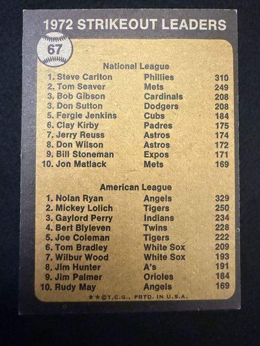 1973 Topps Nolan Ryan Steve Carlton (#67) EX HOFers, K Leaders ^GRUMPYBUCK^