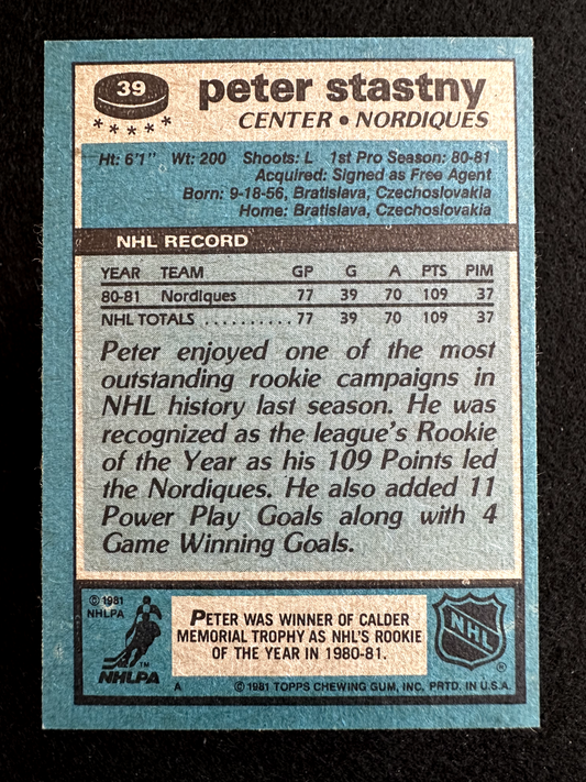 1981–82 Topps Peter Stastny (#39) NM HOFer, Rookie Card, Nordiques ^GRUMPYBUCK^