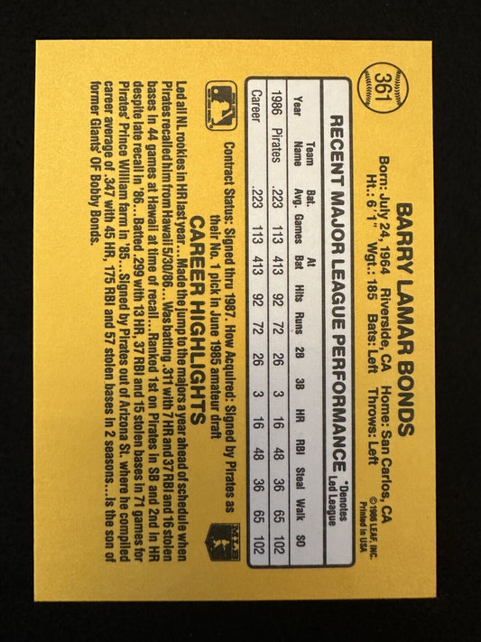 1987 Donruss Barry Bonds (#361) NM Home Run King, Rookie Card ^GRUMPYBUCK^