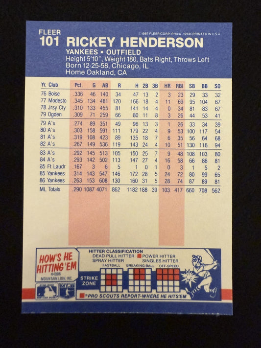 1987 Fleer Rickey Henderson (#101) NM HOFer, A’s/Yankees Speedster ^GRUMPYBUCK^