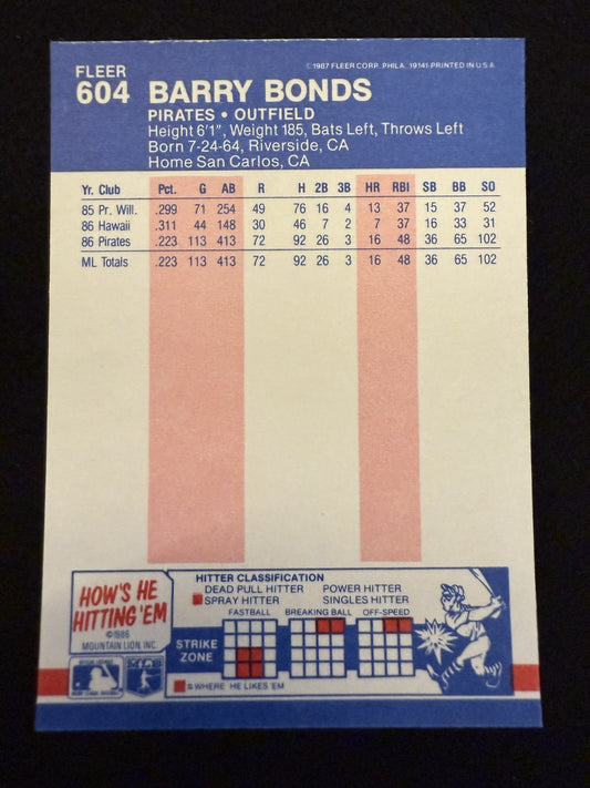 1987 Fleer Barry Bonds (#604) NM Rookie Card, Home Run King ^GRUMPYBUCK^