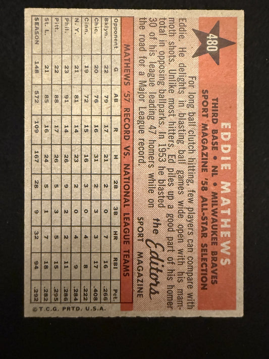 1958 Topps All-Star Eddie Mathews (#480) EX HOFer, Braves Great ^GRUMPYBUCK^