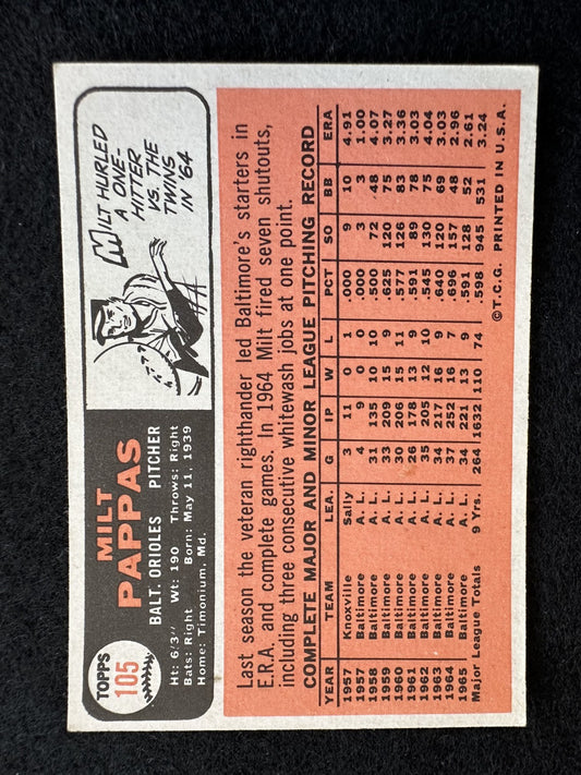 1966 Topps Milt Pappas (#105) EX All Star, Orioles Great ^GRUMPYBUCK^